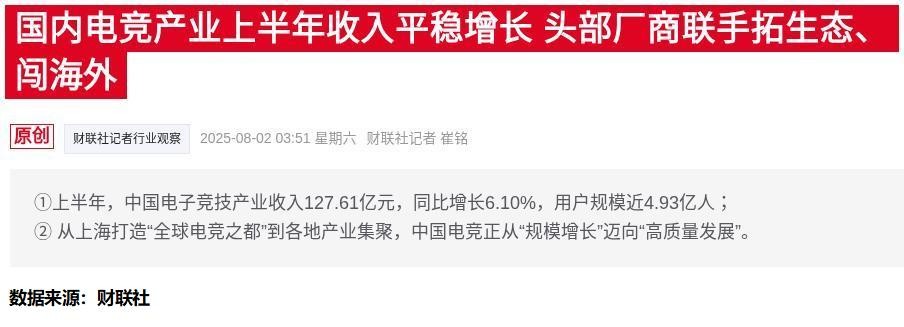 $广正股份(SZ871841)$今年8月份,深圳市、上海静安区相继宣布大手笔投资建造电竞产业园。其中,深圳电竞园区投资金额高达25亿元。各地政府对电竞产业重视的背后是电竞的商业潜力已不可小觑。8月1日发布的《2025年1-6月中国电子竞技产业报告》(以下简称《报告》)显示,上半年中国电子竞技产业收入127.61亿元,同比增长6.1%,用户规模近4.93亿人。 在此基础上,中国电竞产业也正在通过与海...