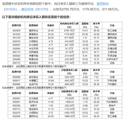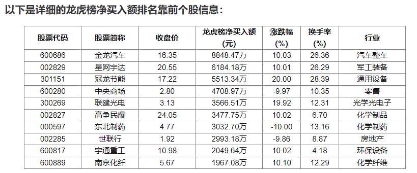 8月13日龙虎榜,金龙汽车(600686)、星网宇达(002829)、冠龙节能(301151)为当日龙虎榜净买入额前三,分别为8848.47万元、6184.18万元、5513.34万元。#强势机会#8月13日板块资金主力净流入:券商3.64亿、商用车3.16亿、电池2.98亿、贵金属2.29亿、元器件2.18亿、航天装备1.69亿。#央行将借入国债,债市影响几何?#8月13日板块资金主力净流出:中...