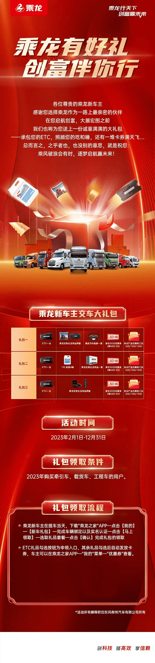 乘龙有好礼,创富伴你行!买车就送乘龙交车大礼包!