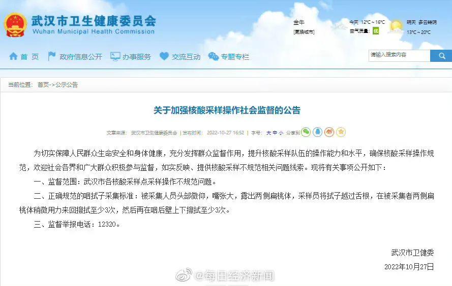 中国基金报泰勒大家好,周六晚间简单看点新闻。武汉明确咽拭子采集至少擦拭6次近日,武汉市卫健委发布关于加强核酸采样操作社会监督的公告,为切实保障人民群众生命安全和身体健康,充分发挥群众监督作用,提升核酸采样队伍的操作能力和水平,确保核酸采样操作规范,欢迎社会各界和广大群众积极参与监督,如实反映、提供核酸采样不规范相关问题线索。现将有关事项公开如下:一、监督范围:武汉市各核酸采样点采样操作...