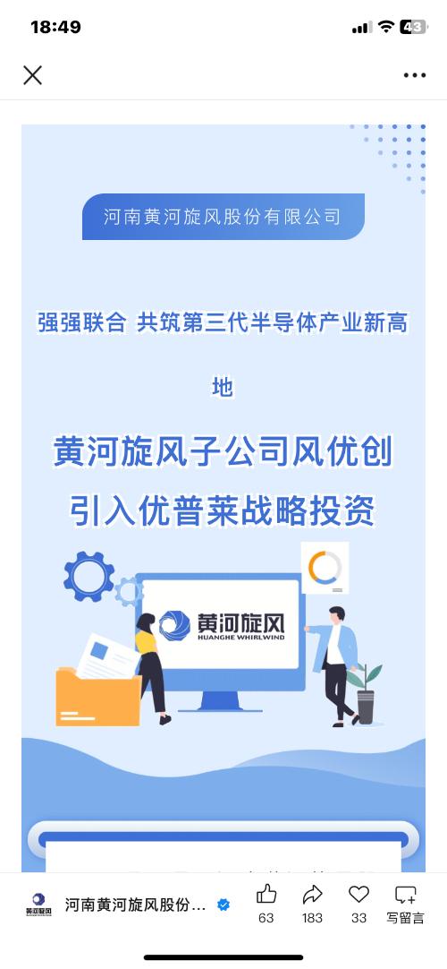 $第三代半导体(BK0952)$ 强强联合共筑第三代半导体产业新高地.9月17日,河南黄河旋风股份有限公司(以下简称黄河旋风)与深圳优普莱等离子体技术有限公司(以下简称优普莱)达成重要合作成果。优普莱将以出资人身份,通过增资扩股的形式正式入股黄河旋风的全资子公司河南风优创材料技术有限公司(以下简称风优创)。增资扩股后,风优创由目前注册资本1000万元变更为2000万元。其中,黄河旋风认缴注册资本1...