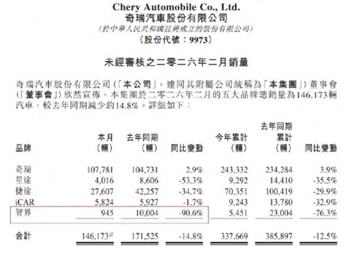奇瑞汽车发布的最新产销快报显示,智界汽车今年2月销量945辆,同比暴跌90.6%。 这一数字在鸿蒙智行“五界”体系中显得格外刺眼,同期问界交付约1.8万辆,享界超4000辆。 仅仅两个月前,智界还处于连续三个月月销破万的稳健增长态势,如今从“万级俱乐部”跌落至三位数销量,形成了巨大的反差。 智界的销量困境并非一日之寒。从2025年年底交付量达到顶峰后,品牌销量便持续下滑,2026年1月降至3821...