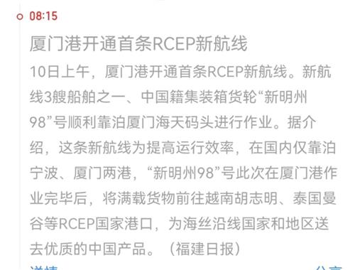 海关总署答澎湃:已与RCEP成员中5国签署AEO互认安排澎湃新闻2022-01-1411:13澎湃新闻官方帐号,优质财经领域创作者海关总署新闻发言人、统计分析司司长李魁文澎湃新闻记者周頔摄1月14日,在国务院新闻办举行的2021年全年进出口情况新闻发布会上,澎湃新闻记者提问:RCEP已于1月1日正式生效。能否请您介绍一下去年中国对RCEP成员国的贸易情况?海关在推动RCEP实施方面具体做了...