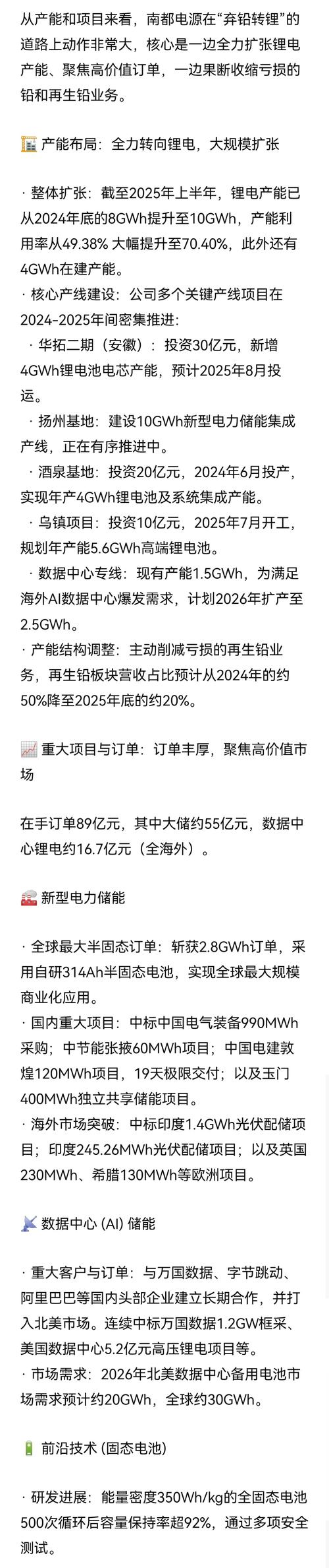 $南都电源(SZ300068)$可以建仓没有? 通过大数据分析,南都潜力很大。 1、铅业务占比开始缩减、剥离。 2、锂电池业务、锂电池回收占比开始变大,业务、回收也有开始新增产能,2026年中有可能开始释放。 3、储能方面,公司出海前景不错,海外订单有不少。 4、储能方面,公司国内的发展也开始有新起色。 5、按2024年算7—8元的支撑基本面,在上面四点的情况下,特别是新增产能一旦正式全部释放投产...