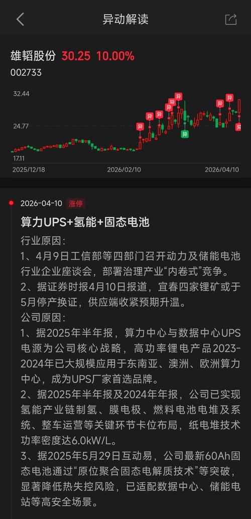 $雄韬股份(SZ002733)$数据中心电源+固态电池+氢能+新型储能。 1、据2025年半年报,算力中心与数据中心UPS电源为公司核心战略,高功率锂电产品2023-2024年已大规模应用于东南亚、澳洲、欧洲算力中心,成为UPS厂家首选品牌。 2、据2025年半年报及2024年年报,公司已实现氢能产业链制氢、膜电极、燃料电池电堆及系统、整车运营等关键环节卡位布局,纸电堆技术功率密度达6.0kW/L...
