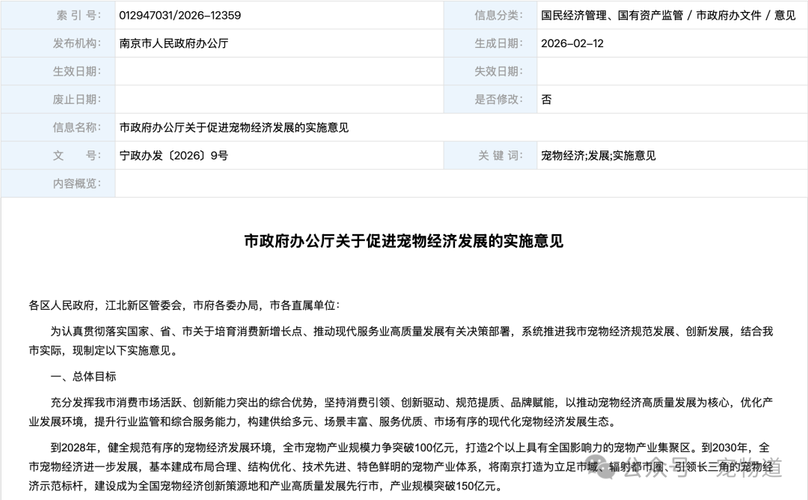 正式《意见》较之前的《征求意见稿》有明显的换挡提速,到2028年,宠物产业规模从70亿元提至100亿元;到2030年,宠物产业规模从100亿元提至150亿元。 宠物道消息,2月12日,南京市正式发布《关于促进宠物经济发展的实施意见》。 资料来源:南京市人民政府办公厅 到2028年,健全规范有序的宠物经济发展环境,全市宠物产业规模力争突破100亿元,打造2个以上具有全国影响力的宠物产业集聚区。到20...