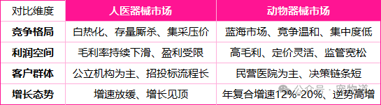 宠物医疗器械行业存在独特的临床刚需,这也是多数跨界人医企业的核心短板。 当前国内人医器械行业已全面进入集采常态化、市场内卷白热化阶段,行业盈利空间持续承压:存量市场低价厮杀加剧,国产厂商同质化竞争严重,外资品牌份额不断收缩,企业毛利率大幅下滑,传统主业增长见顶,各大上市器械企业亟需寻找新的业绩突破口。 在此行业格局下,宠物医疗赛道凭借高景气度、高盈利性、低竞争度的优势,成为企业避险增收、开辟增量版...