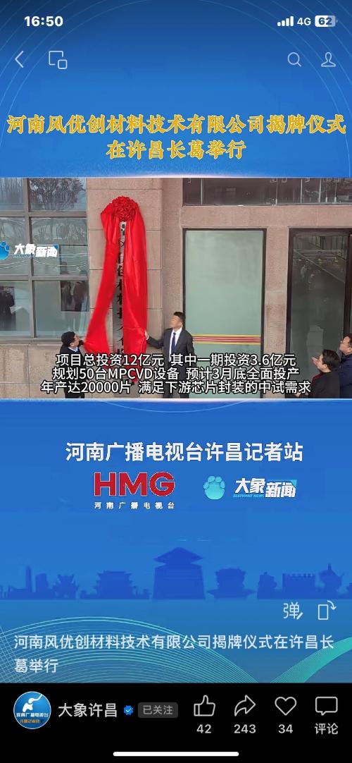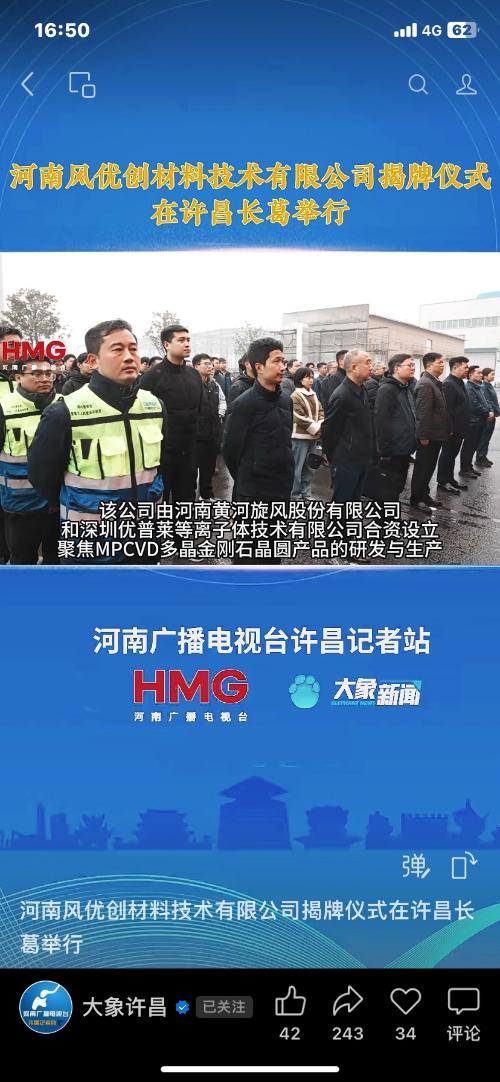 $培育钻石(BK1023)$ 黄河旋风子公司河南风优创材料有限公司在许昌正式揭牌。 河南风优创材料技术有限公司是一家专注于新材料技术研发与生产的科技企业,成立于2025年6月18日,注册地位于河南省许昌市长葛市,法定代表人为王适。公司注册资本为2000万元人民币,由河南黄河旋风股份有限公司与深圳优普莱等离子体技术有限公司共同出资设立。其中黄河旋风持股51%,深圳优普莱持股49%。 公司核心业务聚焦...