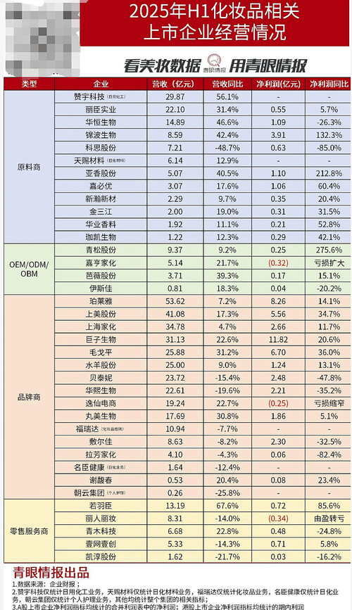 青眼情报梳理37家已披露年中财报的中国化妆品相关上市企业业绩,从上游原料端到工厂,从品牌商到零售服务商,本文将从全产业链视角分析2025年化妆品生意好不好。 营收、净利润双增长 2025年上半年,中国化妆品行业交出了一份亮眼的成绩单,从37家已披露年中财报的上市企业数据来看,化妆品生意整体呈现稳健增长态势。总营收达479.38亿元,同比增长11.04%;净利润达56.21亿元,净利润率为11.7%...