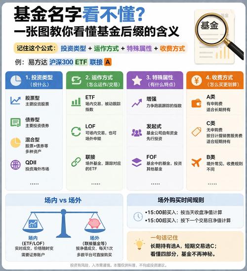 其实基金名字不是乱起的。真正有用的信息,几乎都藏在后缀里。 看懂基金名字,才是投资的第一步。 1/基金名字一般可以拆成4部分: 投资类型+运作方式+特殊属性+收费方式 你看到的那些长名字,基本都在讲这4件事。 只要拆开看,就不神秘了。 2/先看最常见的:A、C这两个字母,代表的是收费方式。 A类:买入时要付申购费 C类:买入通常没有申购费,但每天会多收销售服务费 一句话记住:长期持有,通常更适合A...