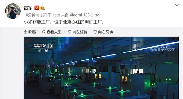 有段时间没发微博的小米创始人雷军这两天恢复了正常的发博频率,刚刚雷军又在微博上晒了小米的黑灯工厂,又上央视报道了。小米的黑灯工厂位于北京亦庄,这是小米打造的第一个智能工厂。据了解,小米智能工厂位于亦庄,占地18600平方米,它不仅仅是工厂,还是小米的实验室,担任新工艺、新材料、新技术,以及突破性新产品的预研,工厂内部由小米自研的全智能机器把控,采用微米级除尘科技。在这个工厂中,生产制造采用全自动生...
