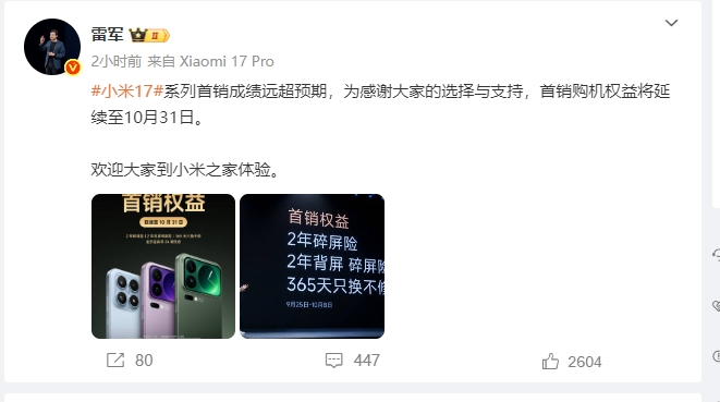 众所周知,雷总是超级营销大师,自媒体在他手里简直就是点石成金的工具。继上次全网演讲之后,雷总就没有声音了,这让米粉们非常难受和期待。也许,这就是雷总想要的结果,被极致期待的情绪价值! 雷总10月7日终于在其个人微博发文称:“小米17系列首销成绩远超预期,为感谢大家的选择与支持,首销购机权益将延续至10月31日。欢迎大家到小米之家体验。” 什么意思?几个意思?雷总的意思是首销很好,还想要更好?还是首...