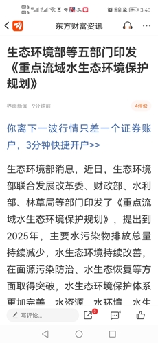 $环保(HKBLOCK|HK44)$生态环境部消息,近日,生态环境部联合发展改革委、财政部、水利部、林草局等部门印发了《重点流域水生态环境保护规划》,提出到2025年,主要水污染物排放总量持续减少,水生态环境持续改善,在面源污染防治、水生态恢复等方面取得突破,水生态环境保护体系更加完善,水资源、水环境、水生态等要素系统治理、统筹推进格局基本形成。展望2035年,水生态环境根本好转,生态系统实现...