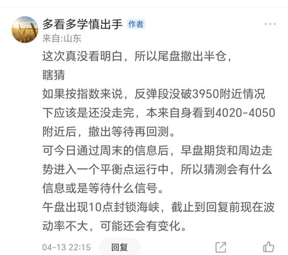 - 4.13 大盘:一部分已经走到了180度的价格,一部分还未到,到了180度附近的个股大差不差的,可以考虑减。股票比的是成本,如果你把这部分盈利拿到你想的目标,我觉得没有问题,如果你是重仓拿着去你想的目标,大概率不会成功。这就是一将功成万骨枯的选择题。股票的筹码永远是散户的敌人,散户持有的越多,股票越不涨,直到散户卖出了。并不是这个股票牛不牛的起来,而是筹码有没有转移。当然还涉及大小周期的问题,中长资金的问题。这些不能一概而论。最轻松的操作,就是我说的,赚1%心安理得即可。往往会有意外之喜。