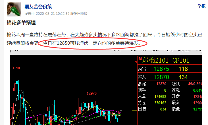全部 热门 最新评论 最新发帖 全部 全部 个人号 机构号 股友7963uO3016 发表于 2020-08-24 21:31 140次浏览 棉花多单获利 棉花预埋伏的多单可还行,高开直接获利 分享 评论 赞 股友7963uO3016 发表于 2020-08-21 10:22 137次浏览 棉花多单预埋 棉花本周一直维持在震荡走势,在大趋势多头情况下多次回调都拉了回来,今日短线小时图空头已经缩量即将金叉,今日在12850可线埋伏一定仓位的多单等待爆发。 分享 评论 1 发帖 APP内打开