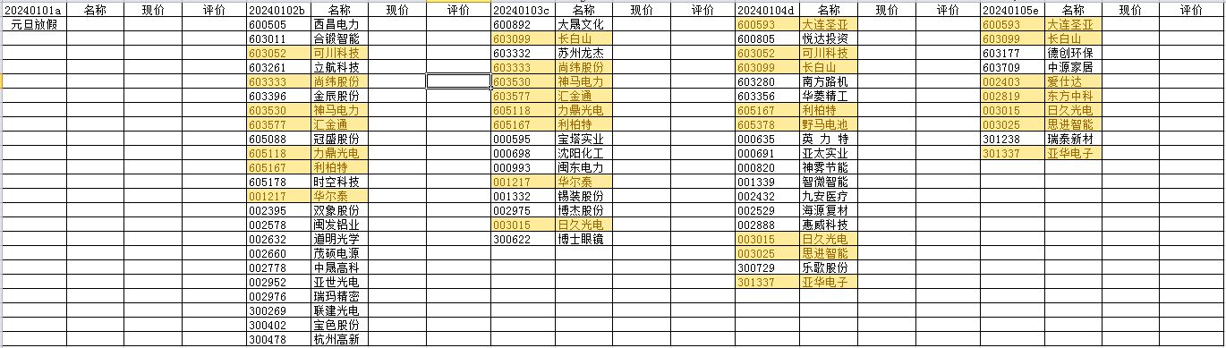 2024年1月第一周强势涨停股,其中1个板为游资一日游,2~3个板为小庄,3~5个板为中庄,5~8个板为长庄,8个板以上为主力。涨停为指标在高位,也许第二天就要出货;但强庄是指标高位钝化,可以连续涨停。希望高手注意,避免风险。