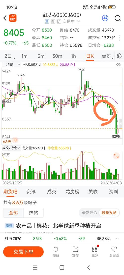 红枣已经破位下行,看这下跌的力度,可能要到7200。 个人观点不构成买卖的建议! 期货市场风险巨大,投资者买卖审慎抉择!2026.4.7.