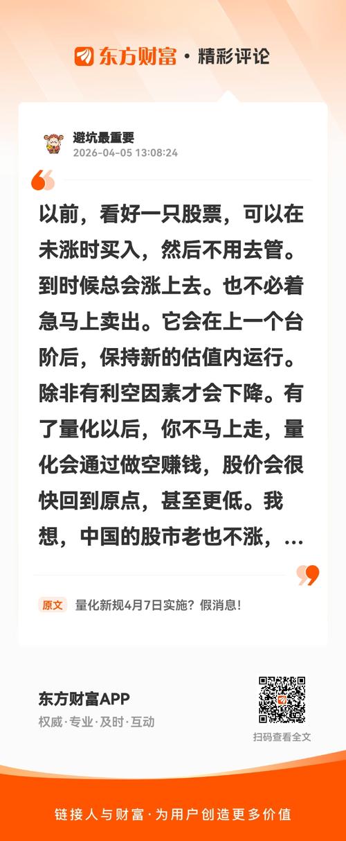 以前,看好一只股票,可以在未涨时买入,然后不用去管。到时候总会涨上去。也不必着急马上卖出。它会在上一个台阶后,保持新的估值内运行。除非有利空因素才会下降。有了量化以后,你不马上走,量化会通过做空赚钱,股价会很快回到原点,甚至更低。我想,中国的股市老也不涨,量化交易是很大的原因。因为它通过做空变相获得t+0的优势。 我在《量化新规4月7日实施?假消息!》的评论获得了大家的关注。