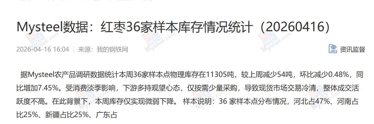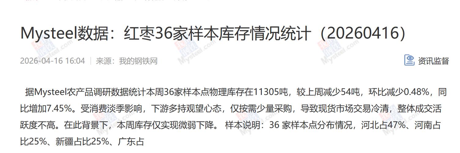 $红枣主连(CZCE|CJM)$据Mysteel农产品调研数据统计本周36家样本点物理库存在11305吨,较上周减少54吨,环比减少0.48%,同比增加7.45%。