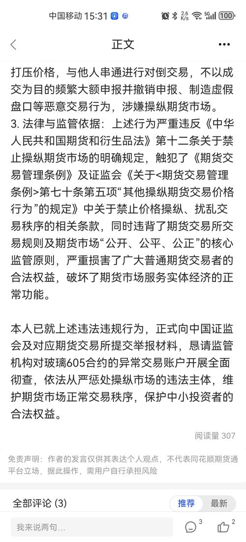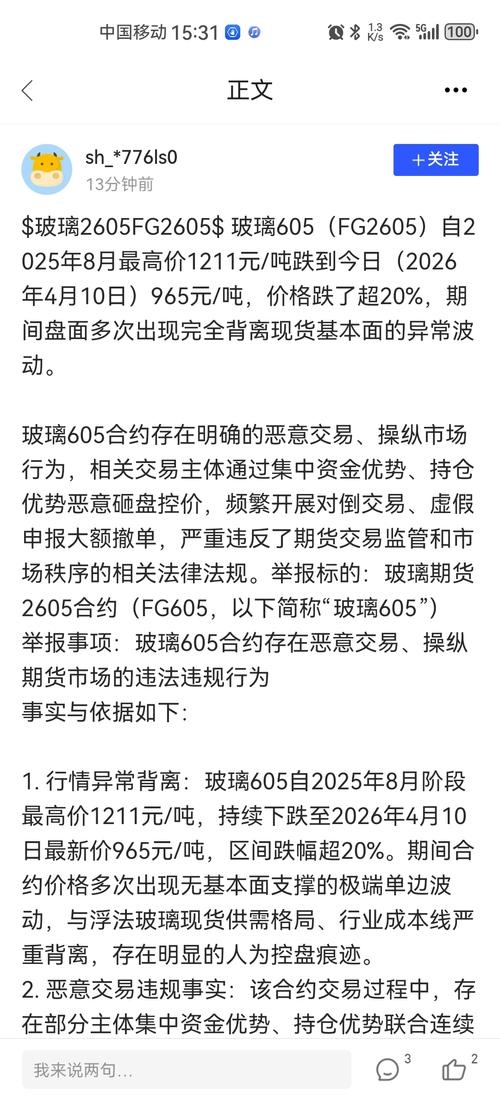 $玻璃605(CZCE|FG605)$ 玻璃605(FG2605)自2025年8月最高价1211元/吨跌到今日(2026年4月10日)965元/吨,价格跌了超20%,期间盘面多次出现完全背离现货基本面的异常波动。 玻璃605合约存在明确的恶意交易、操纵市场行为,相关交易主体通过集中资金优势、持仓优势恶意砸盘控价,频繁开展对倒交易、虚假申报大额撤单,严重违反了期货交易监管和市场秩序的相关法律法规。举...