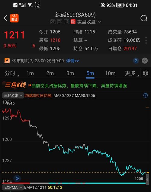 $纯碱609(CZCE|SA609)$短期的5分钟周期,东方财富的三色K线,依然是空头排列 东方财富的三色K线为空