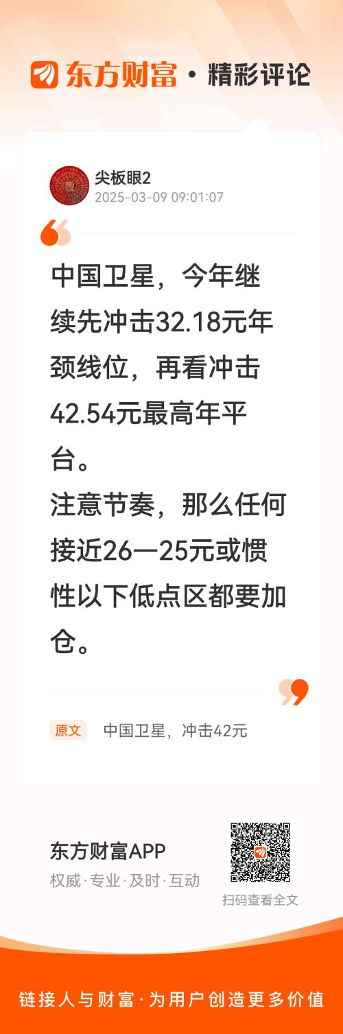 //@尖板眼2:中国卫星,今年继续先冲击32.18元年颈线位,再看冲击42.54元最高年平台。 注意节奏,那么任何接近26—25元或惯性以下低点区都要加仓。