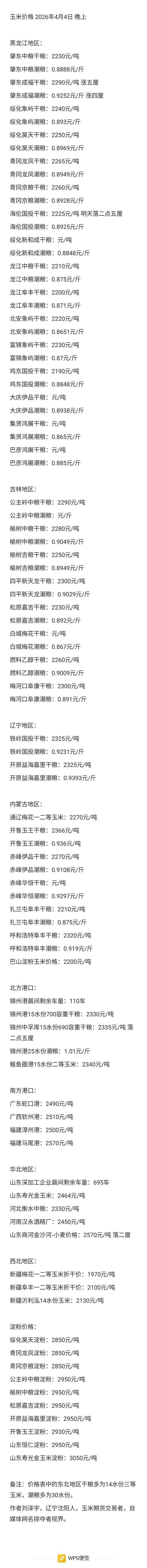 【玉米行情】4月4日,截止到晚上九点之前,东北地区一家企业涨价,一家企业落价。 山东地区一家企业涨价,涨幅五厘,没有企业落价。 东北和山东深加工企业横盘浮动,港口价格平稳。明天东北三省降雨,山东晴天。市场一下子平静了,粮源一刀切,带票的和不带票的各自找出货口。 玉米淀粉:下游需求端按需采购,购销平淡,东北淀粉对比华北淀粉在价格上暂无优势;造纸行业开机率高,淀粉糖需求一般。 小麦:行情平稳,基层余粮...