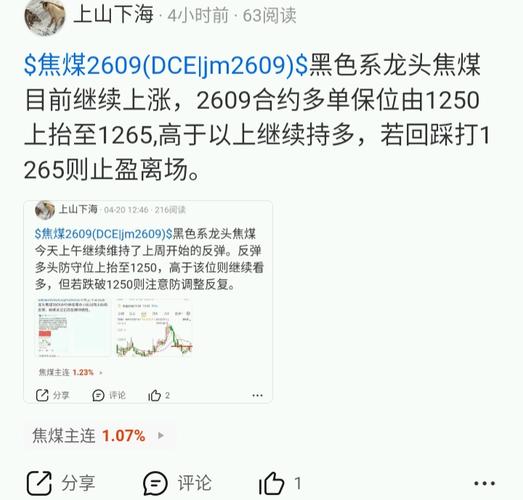 $焦煤2609(DCE|jm2609)$焦煤多头格局延续下午最低只到1267附近,继续高于我的多单盈利保护位上方,所以1265以上目前继续持多。