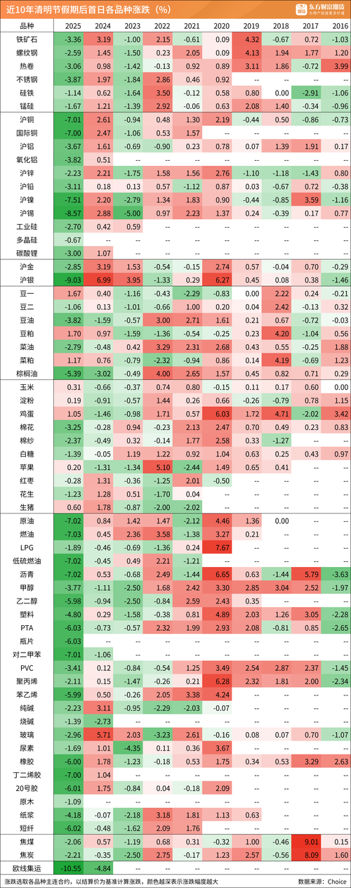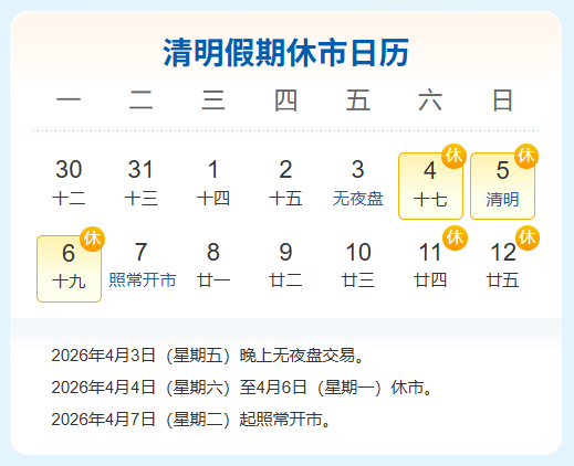 各位用户,大家好! 随着清明节的临近,期货市场即将迎来假期休市安排。为帮助您平稳度过假期,合理安排交易计划,现将相关信息整理如下。 一、清明假期休市安排 根据交易所公告,2026年清明假期期货市场交易时间调整如下: 4月3日(星期五)当晚无夜盘交易。 4月4日(星期六)至4月6日(星期一)休市。 4月7日(星期二)8:55-9:00为商品期货、期权合约的集合竞价时间,当晚恢复夜盘交易。 二、近十年...