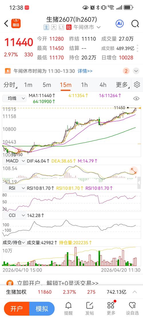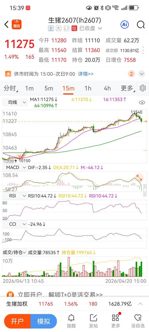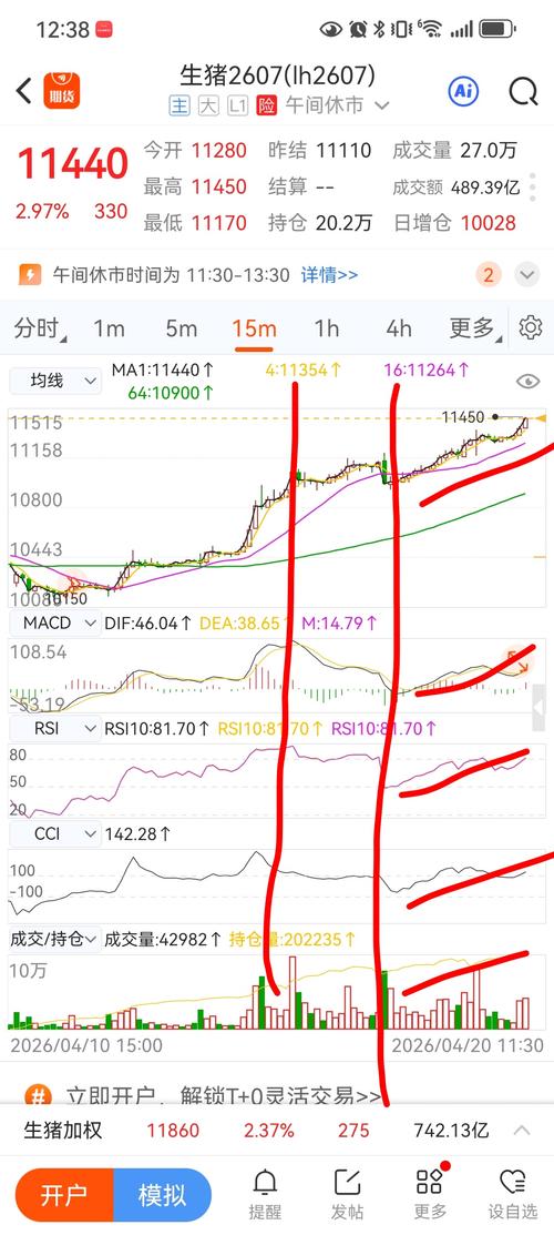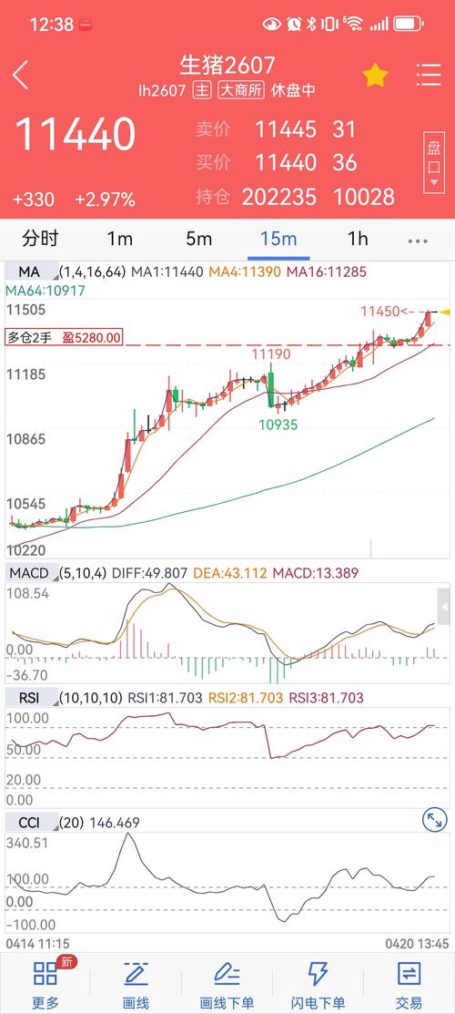 $生猪2607(DCE|lh2607)$上午上班没看盘没动也没加仓。#强势机会##复盘记录##实盘记录# 周五尾盘11275多单两手,小赚5千!现在午盘15分钟线各技术指标,仍是多头向上。一,均线,15分钟周期,仍是多头排列向上,开始量价配合加速向上...