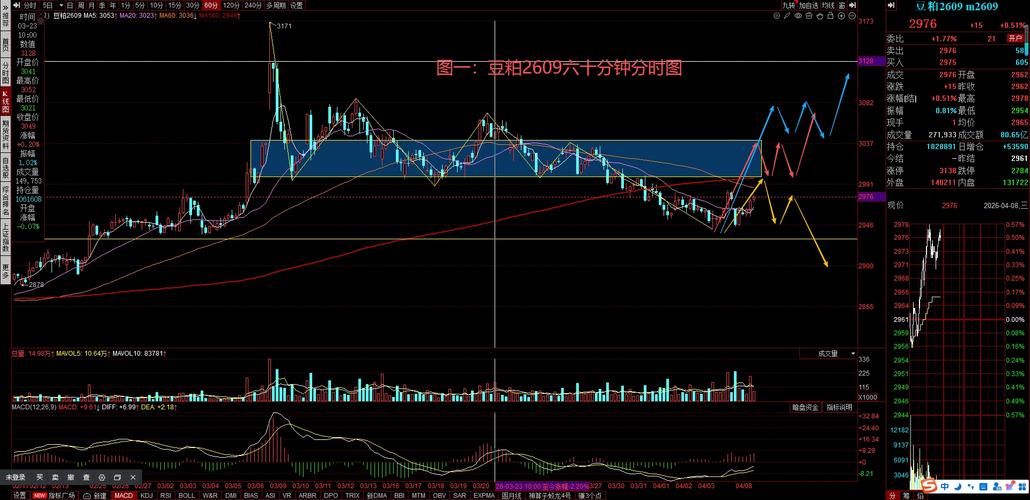 $豆粕主连(DCE|mm)$2026年4月8日豆粕2609走势预测:目前豆粕2609合约上方压力分别为3000,3040,下方支撑为2930目前走势分为三种,第一次如图一黄色线所示,在3000点受到压制,回撤破2930,那么下跌还将继续延续。第二上破3000点往3040附近冲刺,那么回踩踩住3000点时有有望在次冲击3040点压力,大致如图一红色线所示。第三种即是直接上破3040,那么回踩3040...