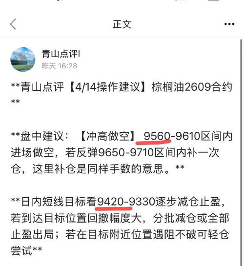 棕榈油2609合约4/14日收盘兑现!策略布局兑现153点空间出局! 夜盘前提示了9560空单(最高9577一带),今日最低9407,提示的空单成功兑现止盈153点空间出局! 青山提示了目标是9420,到达预期附近