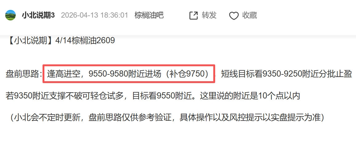 $棕榈油2609(DCE|p2609)$ 4.15棕榈油2609合约 中东局势不确定性仍强,国际油价反复震荡,短期市场依旧高位波动中。马来棕榈油4月上旬产量大幅增加,ITS与AmspecAgri公布4月1-10日马棕出口数据,环比大幅下降近40%,目前的较高植物油价格已经明显影响到需求地区补库意愿,供应压力逐渐增加,棕榈油市场基本面呈现出转弱趋势。 新仓今晚关注9575-9525分批空,短期目标下...