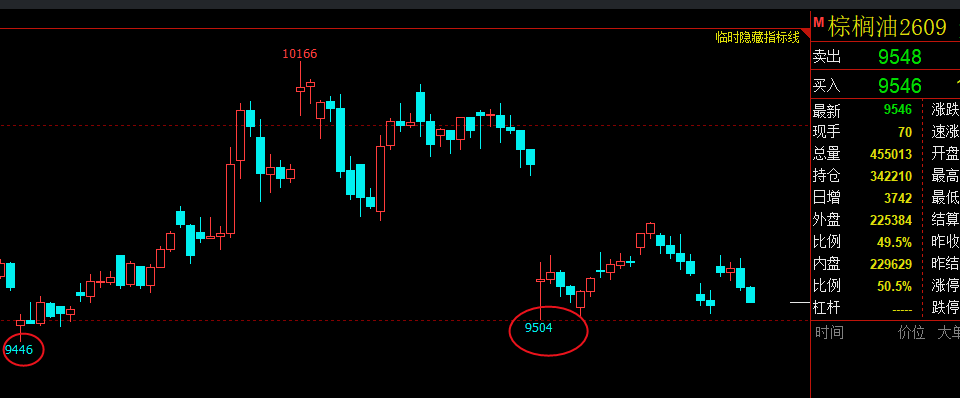 $棕榈油2609(DCE|p2609)$棕榈油09合约反弹到9650继续加kong,短线看到9450下方chuju