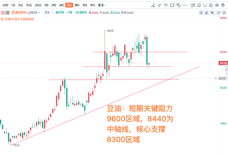 豆油:短期关键阻力9600区域,8440为中轴线,核心支撑8300区域