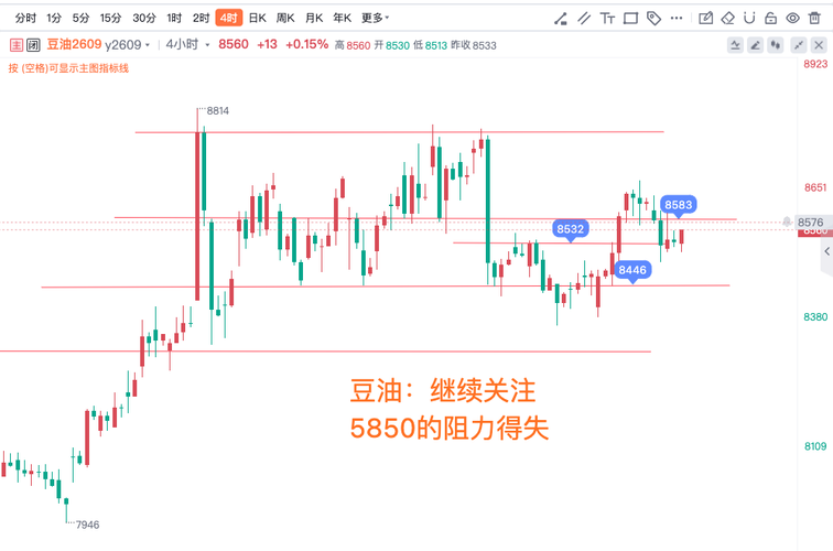 豆油09开盘走出小幅下跌,盘中8570附近的空单走出小幅空间。目前在4小时级别走势上K线继续承压短周期均线维持偏弱一些走势,短线关注下8470一带的支撑带。小时级别走势上目前的区间压缩的比较小,关注下短线调整修复情况。空仓操作上参考8570-80附近继续空,止损50点。