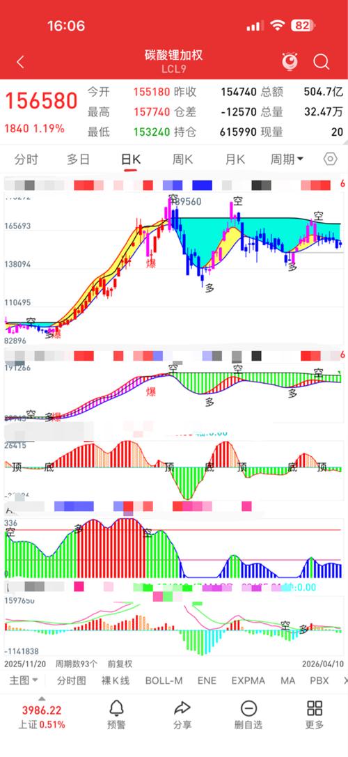 $碳酸锂主连(GFEX|lcm)$碳酸锂5月合约从日级别看,每一次打在60天线附近上都会获得支撑后来一波中级反弹,但反弹的高点也越来越低,而均线上是由多头排列到如今的均线纠结在一起呈空头排列,5天下穿10天线意味着准备用空头排列的趋势向下发散,均线上的这种态势也是一次重大变盘向下的信号,154340这一一个重要点位,跌破154340,意味着是60天线的第三次贯破,事不过三,第三次将有效跌破,跌破1...