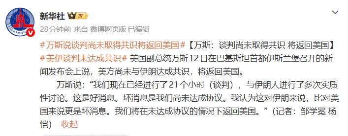 新华社这条快讯直接击碎了市场对“谈判延缓冲突”的侥幸心理,是一个极大利空(地缘风险激化)的信号。以下是详细逻辑拆解: 一、为什么“未达成共识”=战争将继续? 1.谈判失败的直接含义 美方确认:21小时谈判无结果,且没有达成任何临时停火协议。 美方表态:将返回美国,意味着短期谈判窗口彻底关闭,双方失去了最后的缓冲机制。 市场心理:从“观望/博弈缓和”转为“准备应对冲突”,风险溢价(原油、EC2606...