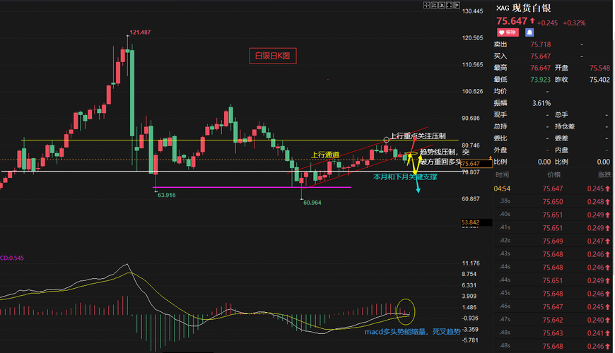 白银日线看,自3月下旬震荡反弹,银价运行在上行通道内,上周震荡弱势下行跌破趋势通道线支撑,均线系统勾头下行呈现空头排列,macd多头势能缩量有死叉趋势,短周期走势看偏弱运行,或有小幅回落空间。 下方暂时关注中轨74.6-74.3支撑,以及下轨在66附近支撑。上方暂时关注日ma5在76.5-77附近和78.3-78.6附近压制,以及80.5-80.8附近承压。 下周或者下个月,需要重点关注的两个攻防...