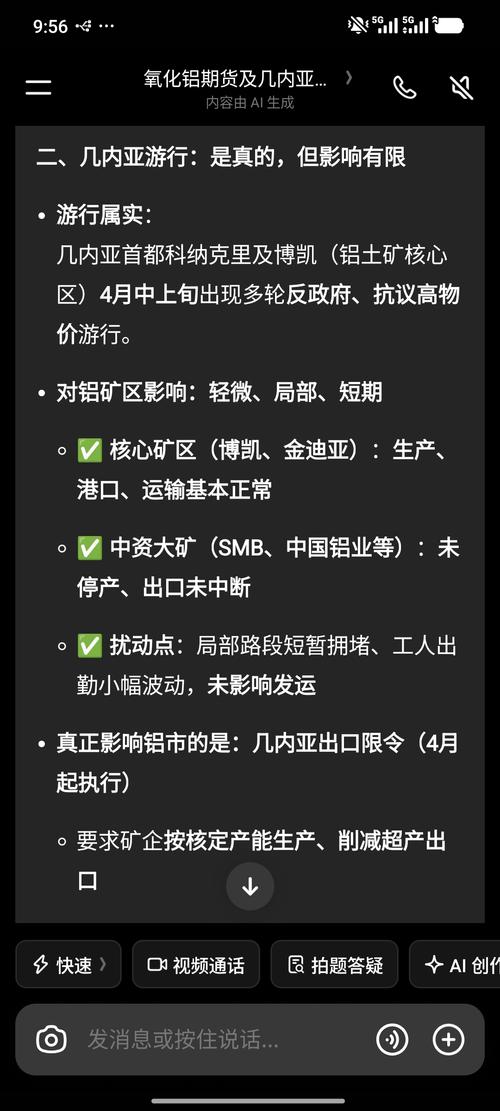 $氧化铝2609(SHFE|ao2609)$ 几内亚反政府游行(2026年4月,最新) 一、背景与现状(截至4月19日) •导火索:军政府宣布5月立法与地方选举延期(5/24→5/31),反对党与民间不满爆发。 •范围:首都科纳克里、博凯(铝土矿核心区)、金迪亚、拉贝等多城爆发游行、路障、冲突。 •冲突:警方用催泪瓦斯、实弹;抗议者封路、烧车、冲击政府机构。 •军控:部分区域宵禁、断网、军警巡逻,...
