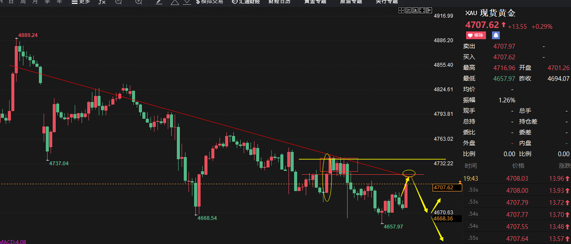 探底回升?晚上需谨慎对待了 目前美伊局势僵持,伊朗开始针对友好国家开放霍尔木兹海峡,并且跟巴基斯坦谈论当前局势,释放有和平的信号,短期市场情绪继续摇摆不定,黄金日内小幅反抽到4710一线就一路震荡回落,午间回踩最低4657一线企稳反抽,目前反抽到了4705附近。 周五晚上又是消息面满天飞,俩种情况第一上方4720强阻力,强势突破后回踩30/40个点顺势做多,第二种情况未破4720轻仓做空,止损47...