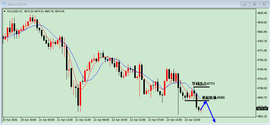 昨日金价走了一个大区间过山车行情,亚盘开盘便大涨后大跌,随后开始震荡,午盘给到4690附近进场多单,美盘到达4740上方,后续未能延续上行,多单手动止盈离场,大赚50美金左右。最终金价是收盘于4691美元,日线收于一根小阴线。 周五(4月24日)特朗普在盘后交易时段宣布,黎巴嫩和以色列已同意将停火协议延长三周。短期利多已落地。停火延长进一步缓解了冲突立即升级的担忧,但市场反应较为温和。不过美伊谈判...