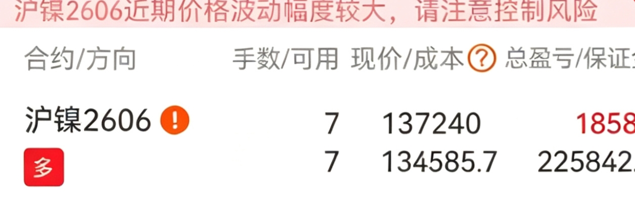 $沪镍2605(SHFE|ni2605)$今开134920空10手,134930锁仓得,幸亏锁了,不然吓死我了。