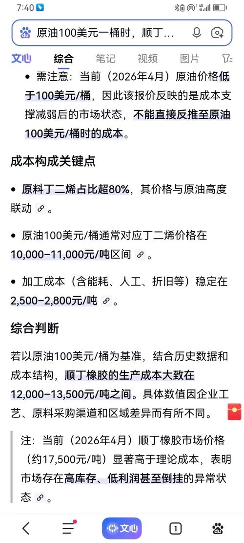 $橡胶2605(SHFE|ru2605)$ 当国际原油价格处于100美元/桶时,顺丁橡胶的生产成本受多种因素影响,包括原料丁二烯价格、加工成本、装置负荷及区域差异等。根据公开资料,可归纳如下: 生产成本估算 理论成本范围:在原油100美元/桶的背景下,顺丁橡胶的理论生产成本约为11,780–13,472元/吨。 例如,2025年4月丁二烯价格约9,100–10,900元/吨,叠加加工成本约2,68...