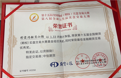 恭喜彩霞湾探贝六期荣获期货日报实盘大赛优秀奖、最佳金融期货交易优秀奖。