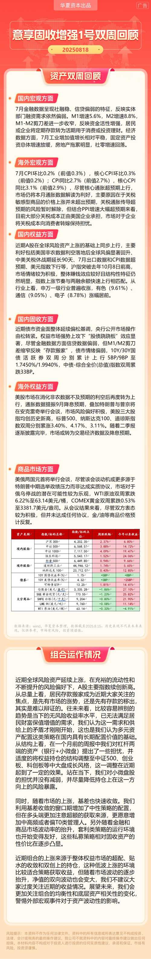 华夏资本-意享固收增强1号双周回顾(2025-8-18)