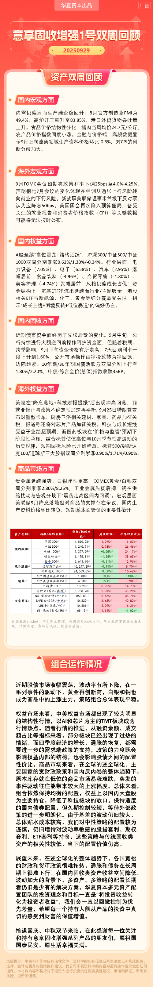 华夏资本-意享固收增强1号双周回顾(2025-9-29)