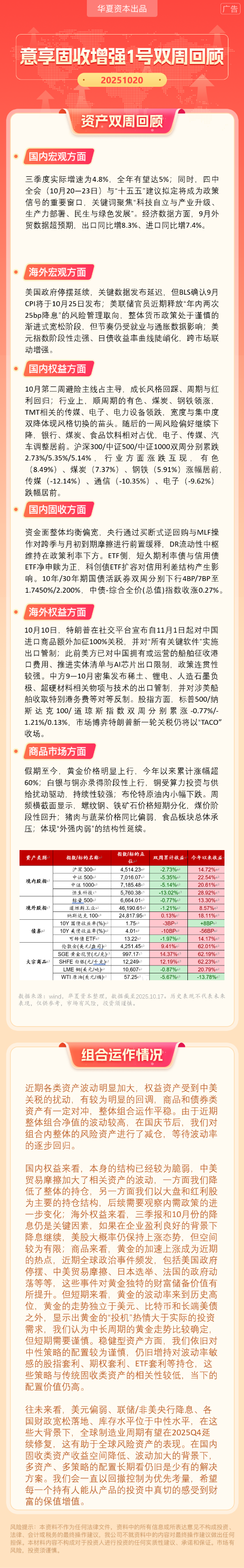 华夏资本-意享固收增强1号双周回顾(2025-10-20)