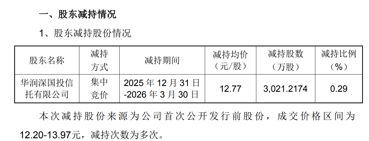 【问】请问今天为何还没有公布大股东华润减持的情况?【答】国信证券:您好,感谢您对公司的关注。公司已于2026年4月1日披露《关于股东减持计划期限届满暨实施情况的公告》(公告编号:2026-011),请您查阅公司在深交所网站及指定媒体发布的公告信息。谢谢!