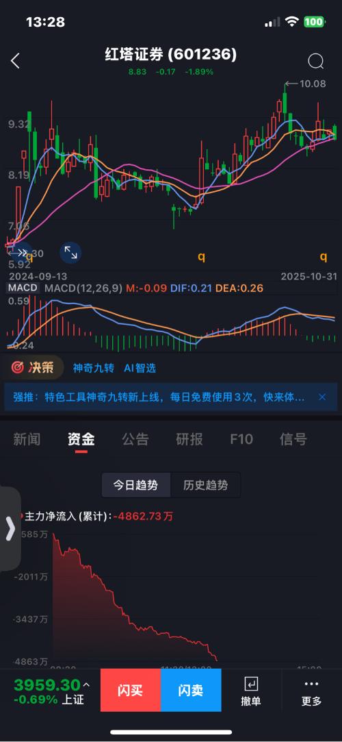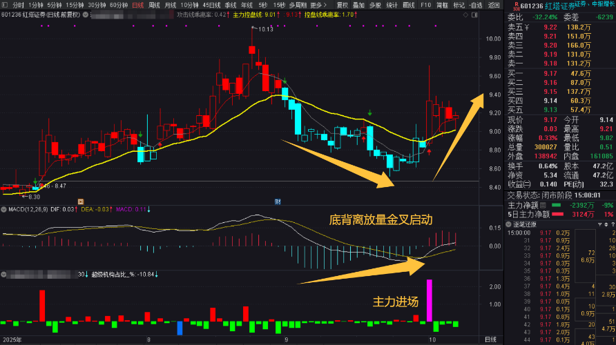 玩股票必须具备“逆向思维和逆向操作”才能在股市中艰难生存。 砖家媒体都劝说散户要玩价值投资长线持股的时候,散户只有玩短线和超短才能生存; 大多数散户都在玩追涨杀跌的时候,你就只能永远坚持买跌卖涨、果断止盈止损才能和大多数散户有不同的结局。 哪里人气不够、哪里抱怨声多,那里就是机会,哪里人气爆棚、哪里亢奋声多,那里就是风险。 红塔证券,主力一个大脚猛踩刹车,同时极速打方向盘,拧出MACD底背离放量金...